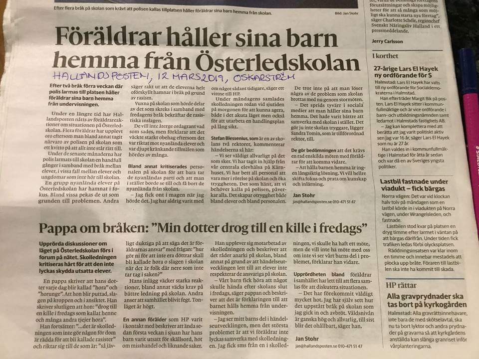 I samhället Oskarström i Halland har föräldrar beslutat att hålla sina barn hemma från skolan, efter flera bråk på Österledskolan.