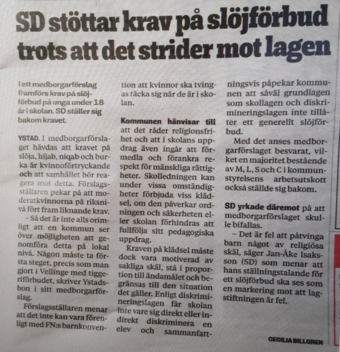 I dagens Ystads Allehanda skriver man om mitt medborgarförslag om slöjförbud i skolan och som förväntat möttes det inte av bifall av kommunstyrelsen. Det enda parti som ställde sig bakom förslaget var SD.