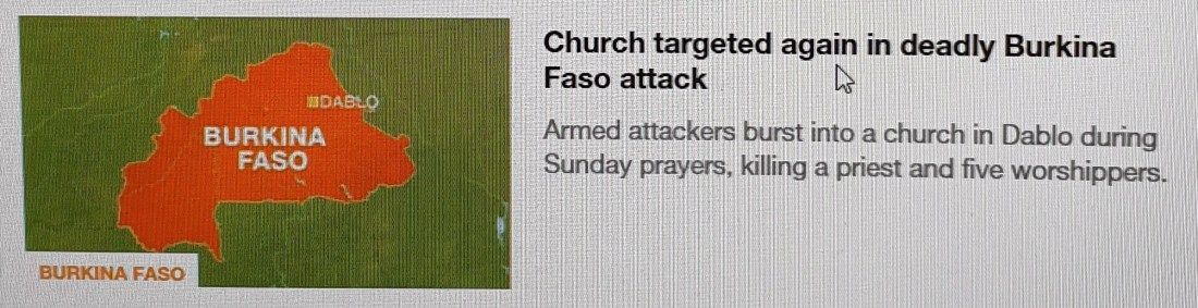 * 20-30 beväpnade män tog sig in i en katolsk kyrka i Dubla, Burkina Faso, under dagens söndagsbön och dödade en präst och fem kristna dyrkare. Förövarna lyckades stänga in flera personer i kyrkan och tände eld på byggnaden. Söndagens blodiga attack kommer två veckor efter en liknande attack mot en protestantisk kyrka i Silgadji.