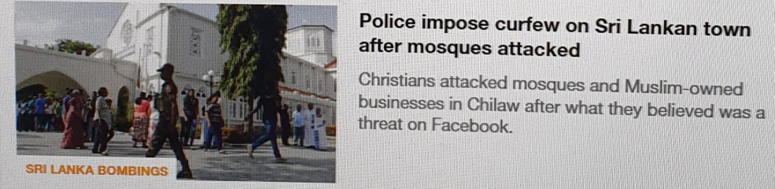 * Kristna attackerade en moské och flera affärer som ägs av muslimer i Chilaw, Sri Lanka, efter ett bråk som började på Facebook. Polisen har nu infört utegångsförbud tills imorgon och det har varit oroligt ända sedan terrorattacken nyligen, med spänningar mellan kristna samt muslimer som ökar för var dag som går.