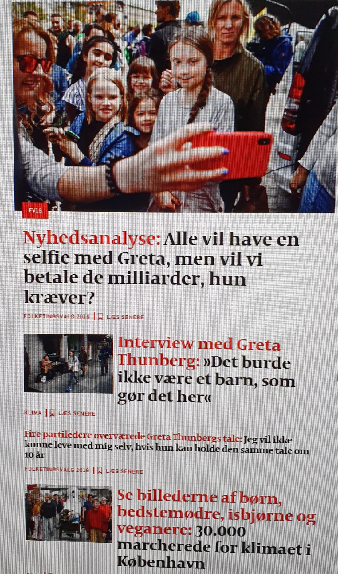 Danskarna verkar lika galna i Greta som svenskarna och idag marscherade 30.000 personer i Köpenhamn, men den danska tidningen Politiken är lite mer ifrågasättande och frågar sig om samhället är villiga att betala de miljarder som Greta kräver i klimatkampen.