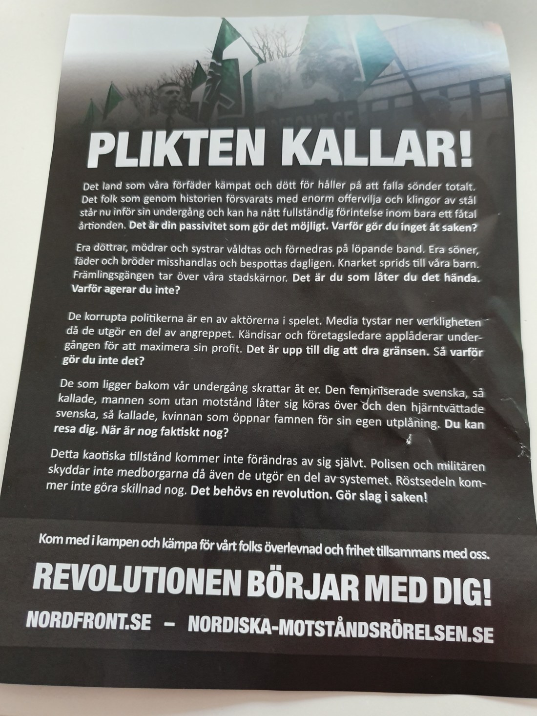 Den här låg i min postlåda idag och efter att ha läst igenom den kan jag konstatera att det verkligen inte är konstigt att högerextrema partier som Nordfront ökar – de säger nämligen precis det som många frustrerade och arga svenskar längtar efter att få höra.Det här trenden hade våra riksdagspartier lätt kunnat vända om de bara orkat ta upp huvudet ur sanden och insupa den polariserade samhällsbild som man skapat samt agerat därefter.Det de etablerade partierna inte vill ta till sig är att folk är evinnerligt trötta på att öppna sina hjärtan och plånböcker samtidigt som de tvingas se på när våra skattepengarna fördelas extremt otättvist. Det gör inte saken bättre att den grova kriminaliteten slagit i taket flera gånger om och att en alltför stor del av förövarna har utländskt påbrå eller inte ens har svenskt medborgarskap samt dessutom för det mesta undgår såväl straff som utvisning. När det blir uppenbart att vi importerar kriminaliteten till vårt land samtidigt som våra politiker förnekar verkligheten så blir hyckleriet ett faktum som är svårt att ignorera.Allt sådant sticker i ögonen på folk, precis som det faktum att migranter får en gräddfil till bostadskön samt till stor del inte behöver betala för vård och läkemedel som vi vanliga dödliga. Det behöver man inte vara Einstein för att förstå, men av någon outgrundlig anledning är det stört omöjligt för våra makthavare att inse denna enkla kalkyl!Det spelar ingen roll att hatet späs på varje dag samt polariseringen och klyftorna ökar, för det intresserar inte våra politiker som redan har sin agenda klar, men då ska de inte heller stå och se ut som frågetecken i media så fort de ser en opinionsundersökning som visar åt vilket håll vindarna blåser!#sommanbäddarfårmanligga