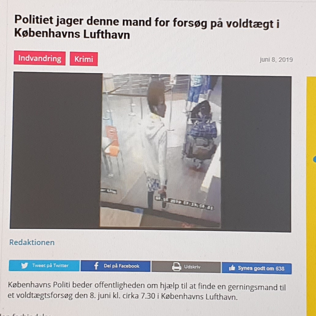 Köpenhamns polis går ut med både bild och fullständigt signalement när de vill sätta fast misstänkta våldtäktsmän. Här senast rör det sig om ett våldtäktsförsök igår morse på Köpenhamns flygplats. En man i 25-30 års åldern, 190-200 cm lång, smal kroppsbyggnad, mörkbrun i huden och svart krulligt hår eftersöks. Han var iförd grå huvtröja, grön/gul t-shirt, svartvitmönstrade shorts med svarta byxor under, vita skor och hade vita telefonhörlurar.
