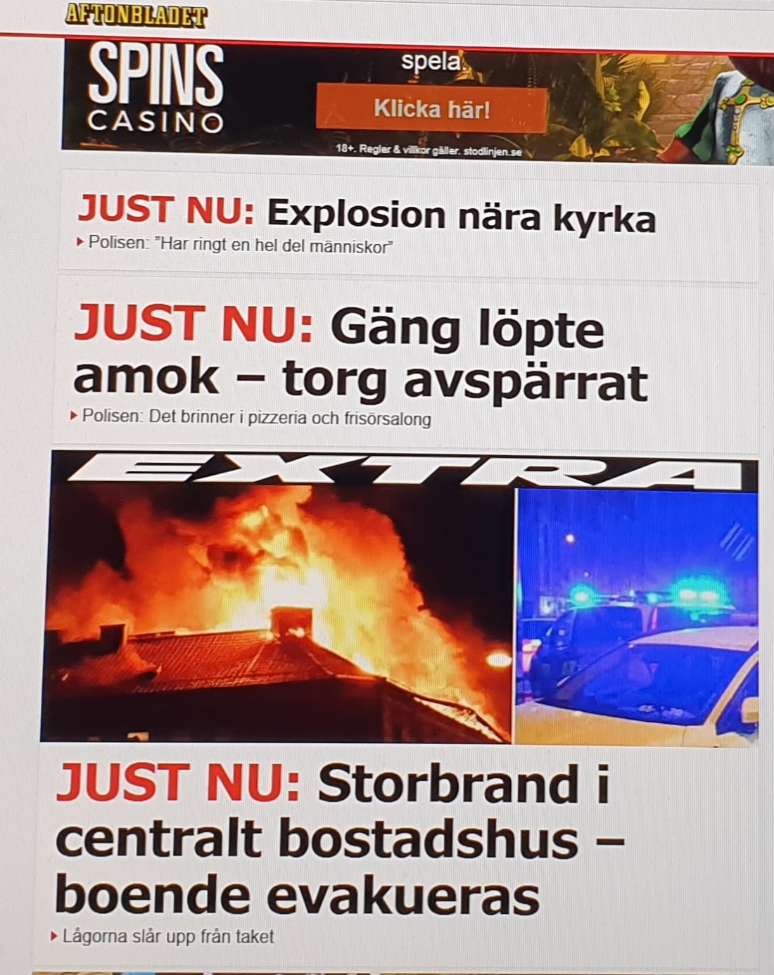 Denna fredagsmorgon bjuder på lika dystra rubriker som resten av veckan och det börjar likna en parodi.Två flerfamiljshus i Malmö står i brand och de boende har evakuerats. I Borås löpte ett gäng amok på ett torg och tände eld på en pizzeria där både café, en butik, ett bibliotek, en frisörsalong och en ungdomsgård fick stora skador. Dessutom har det skett en explosion nära en kyrka i Södertälje så att nationella bombskyddet kallats in (de har haft bråda dagar den här veckan).Det hela börjar ta löjeväckande proportioner, men vem bryr sig? Det drabbar inte mig och snart är det semester och sommarlov att njuta av tänker såväl gemene man som våra politiker – inte en chans att Morgan Johansson, Isabella Lövin och Stefan Löfven kommer att ställa in sina semestrar för att lösa en nationell kris. I deras värld existerar det inte ens en kris, utan det här är normalläge.Det är väl fascinerande att Ebba Busch Thor i partiledardebatter låtsas ha en hård framtoning och ifrågasätta regeringens agerande när det gäller såväl den katastrofala migrations- och integrationspolitiken som den ständigt eskalerande kriminaliteten, men när det väl gäller så röstar Kristdemokraterna igenom ännu mer invandring till ett redan blödande Sverige – det är hål i huvudet och EBT får anses vara en skicklig skådespelare som fört många väljare bakom ljuset.Enligt undersökningar vill Svenska folket generellt ha mindre invandring till Sverige – särskilt eftersom man ser resultatet som påverkar samhället rejält i alla instanser och dessutom är en enorm belastning, men våra styrande lyssnar inte på medborgarnas åsikter utan kör över demokratin gång på gång, trots att de sitter med fakta på bordet som påvisar att det inte är lönsamt, polariseringen ökar, landets välfärd vittrar sönder, kriminaliteten inte går att hejda och landets säkerhet hotas av radikal islams utbredning.Eftersom det kuvade folket inte ids protestera och kräva sin rätt, så lär vi få vänja oss vid att varje vecka förfasas över att landet står i brand, saker exploderar, kvinnor och flickor våldtas, människor rånas och misshandlas samt extremismen frodas!Bevare oss väl…