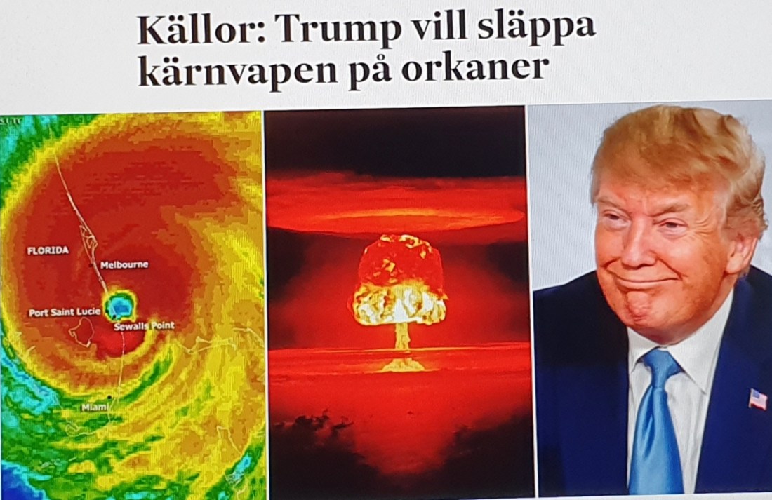 Vid en informationsgenomgång i Vita Huset om en orkan ska den amerikanska presidenten ha sagt: ” Jag har det, jag har det. Varför atombombar vi dem inte?” Trumps förslag var att släppa bomben i orkanens öga efter att den börjat röra sig över Atlanten.”