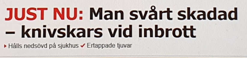 Igår var det en explosion vid ett bostadshus i Hässleholm som förstörde delar av en balkong samt ett fönster och idag är det en knivhuggning av en 50-årig man på en gård utanför Vänersborg som är svårt skadad efter att ha ertappat inbrottstjuvar. Det var väl bara ren tur att de inte tog upp ett skjutvapen och avrättade honom på plats.