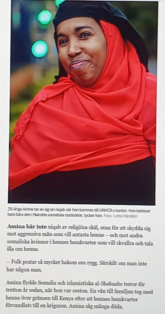 I dagens DN finns ett reportage från Nairobi om hur det går till när Sverige väljer kvotflyktingar utomlands och några av de hoppfulla kandidaterna är den 26-åriga homosexuella Peter vars pojkvän mördades av en böghatande mobb samt 29-åriga Amina som bär ansiktsslöjan niqab för att skydda sig mot aggressiva män som vill antasta henne och för att undgå andra somaliska kvinnors skvaller. Amina tar av sig ansiktsmaskeringen direkt när hon kommer in på UNHCR:s kontor och säger ”skönt!”.