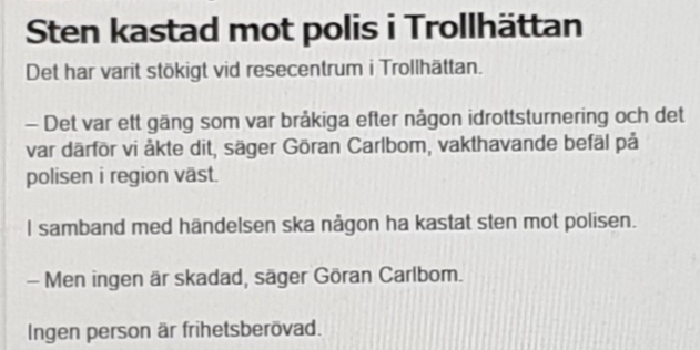 Ungdomar var stökiga i Trollhättan och man kastar sten på polisen, men ingen grips – varför? Vi har en ny lag som började gälla den 1 januari i syfte att klämma åt ligister som inte respekterar blåljuspersonal. Om man inte vill statuera exempel så lär ynglen aldrig lära sig vad som är rätt och fel!