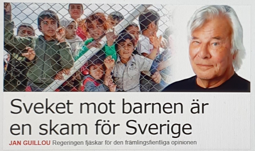 I samma blaska blåser Jan Guillou upp sig och kritiserar regeringen för att inte vilja ta hem IS-barnen till Sverige, vilket är ett svek mot barnen och en skam för Sverige eftersom man fjäskar för den främlingsfientliga och högerextremistiska opinionen genom att lämna dem till sitt öde.