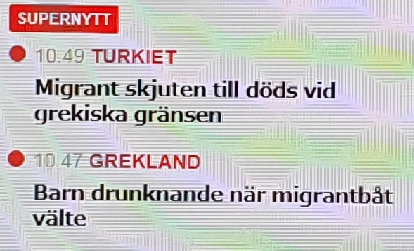 Aftonbladets rubriker basunerar ut att en migrant skjutits till döds vid gränsen samt att ett barn drunknat när en båt med migranter välte. Tragiskt så klart, men absolut inget som borde skapa uppseende. Migrantbåtar förliser praktiskt taget varje vecka såväl utanför Libyens kust som i Medelhavet med kvinnor och barn som drunknar, vilket internationell media brukar skriva om men det är inget som svensk media brukar göra en stor affär av. Att Grekland försvarar sin gräns är heller inget konstigt.