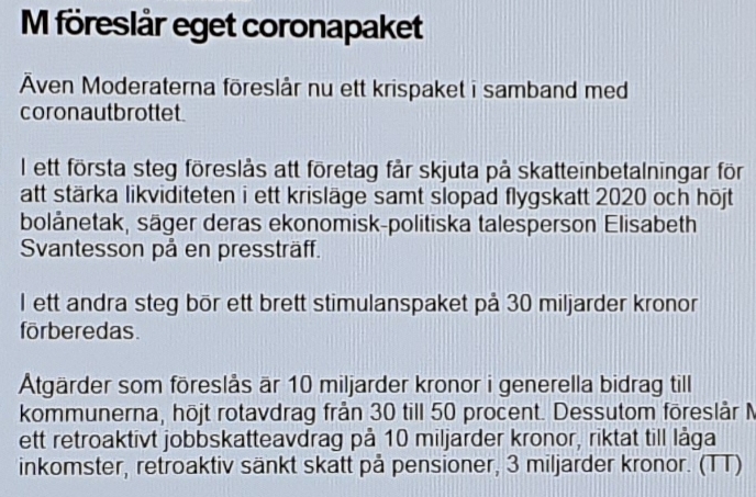 Coronaviruset fortsätter dominera såväl nyhetsflödet som våra politikers agendor och nu senast talar regeringen om att tillsätta ett krispaket. Men Moderaterna vill inte vara sämre utan föreslår nu ett eget stinulanspaket till en kostnad av 30 miljarder kronor. Elisabeth Svantesson pratar om att vi måste rädda jobben. Var pengarna ska tas ifrån framgår dock inte.