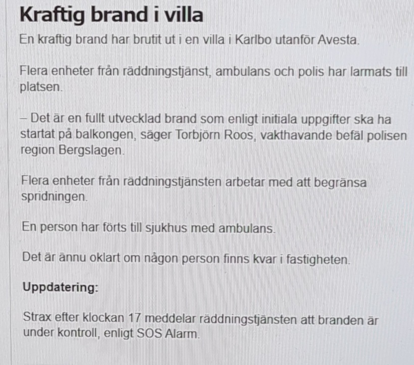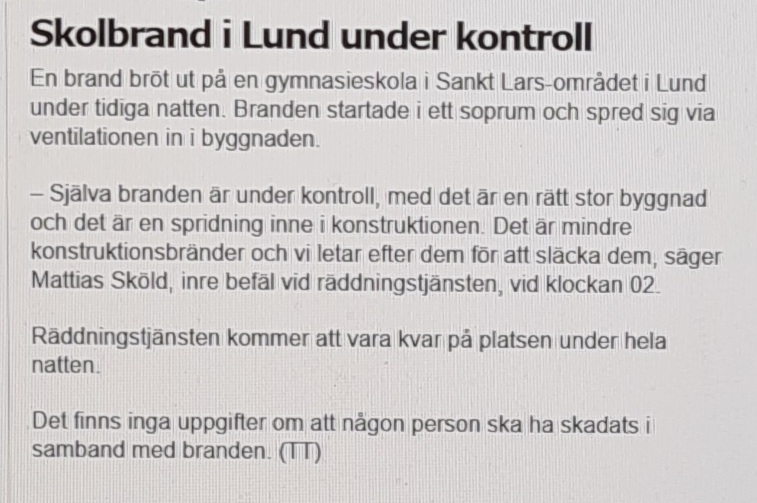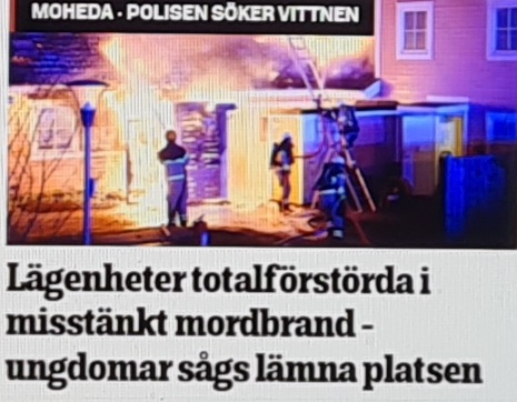 Skolbrand i Lund i natt, en våldsam mordbrand i villa i Avesta igår eftermiddag respektive i en radhuslänga i Moheda i natt samt dessutom en del terrängbränder på olika håll i landet indikerar att det fortsätter brinna regelbundet i Sverige. Skottlossning mot bostadshus i Västerås, flera grova misshandelsfall med knivar och rör/pinnar i Stockholmsregionen och de vanliga ungdomsrånen påminner oss också om att det varit ännu en vanlig dag i det nya otrygga Sverige.