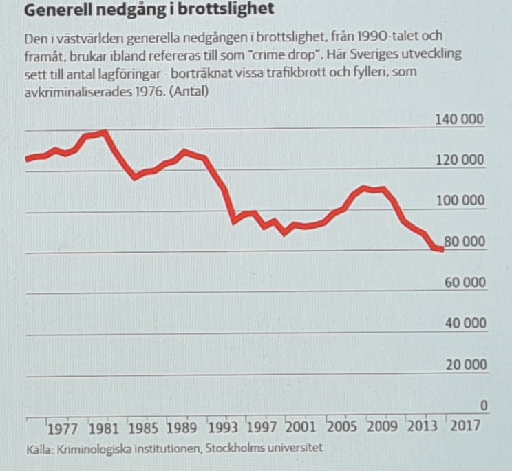 Det är synd att man inte visar statistik per brott, för jag hade gärna velat se kurvan för sexualbrott. Så många våldtäkter som vi haft de senaste åren borde ge utslag på något sätt, men enligt kriminologiprofessor Felipe Estrada Dörner finns det ingen anledning att misstänka att kurvorna har förändrats efter studiens slutdatum – inte heller vad gäller det dödliga våldet som många av oss upplever sker väldigt frekvent numera eftersom det begås av en extremt liten grupp individer som oftast har en rad olika psykosociala problem, vilket gör att de generella huvudtrenderna inte kommer att påverkas.
