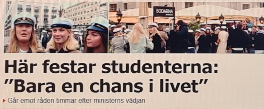 Några timmar senare är Medborgarplatsen i huvudstaden full med ungdomar i vita studentmössor som trotsat uppmaningarna att hålla sig hemma. Många som Aftonbladet pratar med anser att de inte är i riskgruppen och om de varit sjuka skulle de hållt sig hemma. De räknar med fler fester veckorna före studenten.
