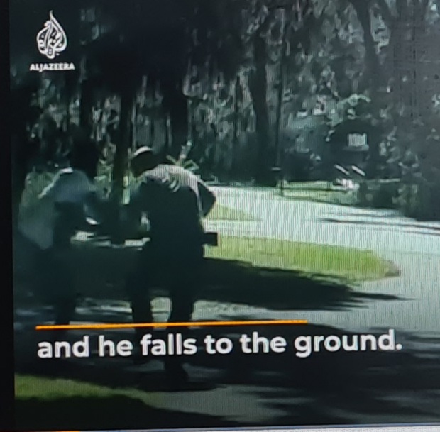 Männen tog sina gevär och började förfölja honom med sin pickup. I videon ser man en svart man som joggar på vänster sida av vägen, medan en pickup är parkerad på motsatt sida med en vit man i bilen och den andra mannen bredvid. Joggaren korsar vägen och passerar pickupen och skottlossning hörs. Sedan visar videon hur joggaren brottas med en man på gatan med ett gevär och sedan hörs ett andra skott medan joggaren knuffar mannen med geväret. Ett tredje skott avlossas på nära håll och joggaren faller ihop.