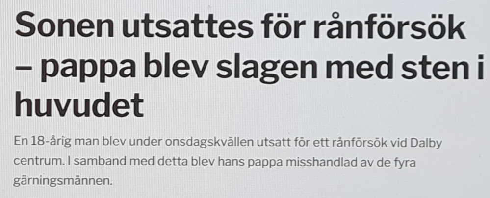 Igår kväll försökte till exempel fyra gärningsmän råna en 18-åring i Dalby centrum i Lunds kommun och hans far blev även misshandlad samt slagen i huvudet med en sten. Är det en slump att det sker i Lilla Dalby som ändå har ansetts någorlunda tryggt en gång i tiden, eller är det snarare så att det numera inte går att känna sig trygg någonstans i dagens Sverige, varken för unga eller gamla?