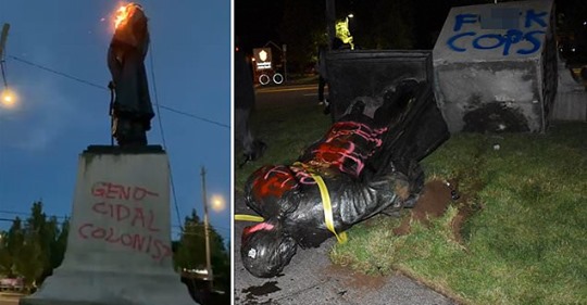 Bilder visar hur statyn draperats i en brinnande amerikansk flagga, vartefter statyn rivs ned och blir liggande med ansiktet mot marken samtidigt som man klottrat ”Folkmordskolonist” och ”kn*lla poliser” med graffitti.