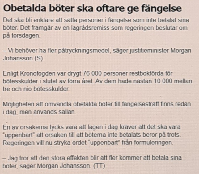 I takt med att problemen hopar sig i landet på grund av såväl växande kriminalitet som bidragsbedrägerier, arbetar våra styrande för att vi ska införa hårdare straff – ofta i form av fängelse som man hoppas ska ha en avskräckande effekt. Som i det här fallet med att för många obetalda böter ska ge fängelse.