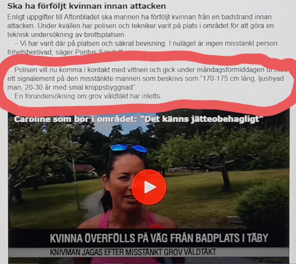 Aftonbladet skriver om den förfärliga våldtäkten i Täby igår när en kvinna förföljdes på vägen hem från badstranden och våldtogs under knivhot. Jag hajade till när jag såg att de för ovanlighetens skull hade ett signalement på den misstänkte gärningsmannen, som polisen annars brukar vara så förtegen med för att inte förstöra utredningen eller vad de brukar säga.