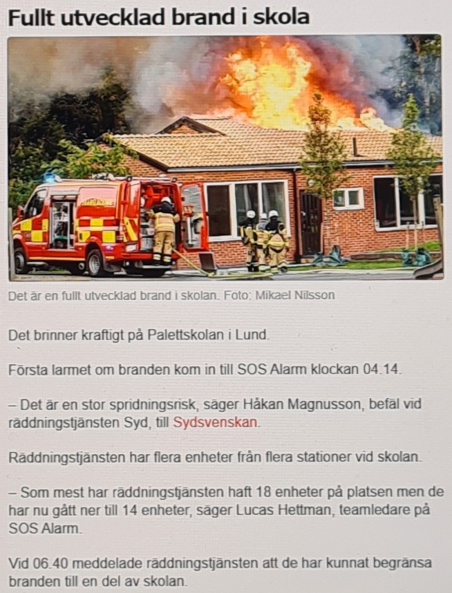 Dessutom har skolpyromanen i Lund, som gäckat polisen i månader, återigen slagit till med sin tolfte skolbrand sedan i mars. Denna gång är det Palettskolan som brinner.