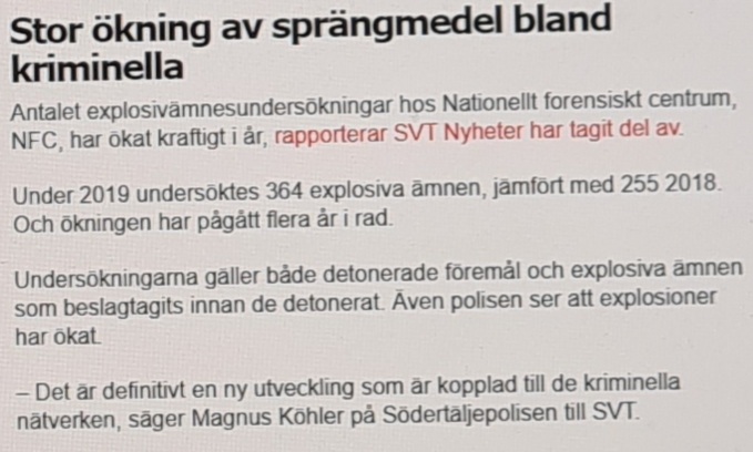 Föga förvånande rapporterar även Nationellt Forensiskt Centrum att antalet explosivämnesundersökningar har ökat kraftigt i år och ökningen har pågått flera år i rad. Även polisen ser att antalet ”explosioner” har ökat samt konstaterar att de kan kopplas till de kriminella nätverken.