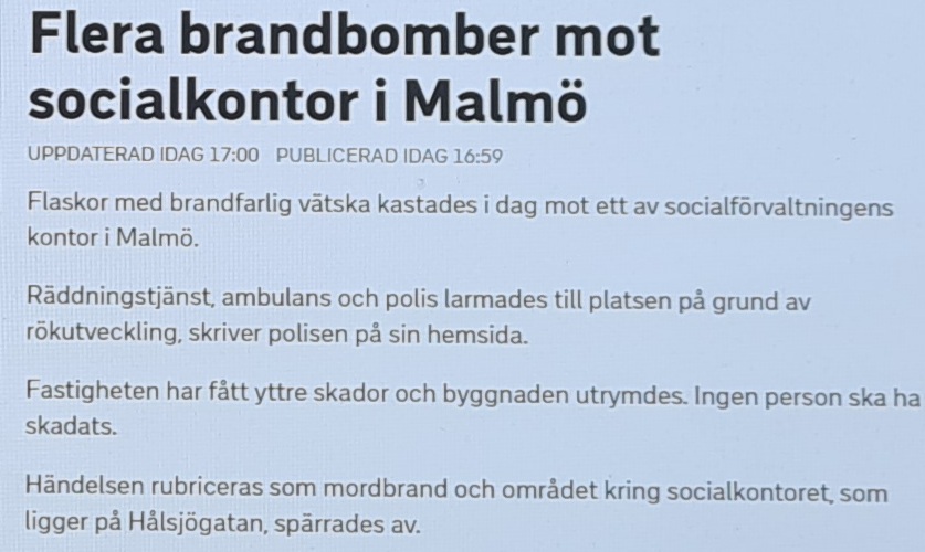 Så skedde till exempel i Malmö tidigare idag när brandfarlig vätska kastades mot ett av socialförvaltningens kontor på Hålsjögatan. Ponera vilket helvete det skulle bli om tusentals missnöjda migranter började attackera personal eller vandalisera byggnader runt om i landet och polisen som inte ens kan hantera den existerande grova brottsligheten skulle hamna i underläge rätt omgående.
