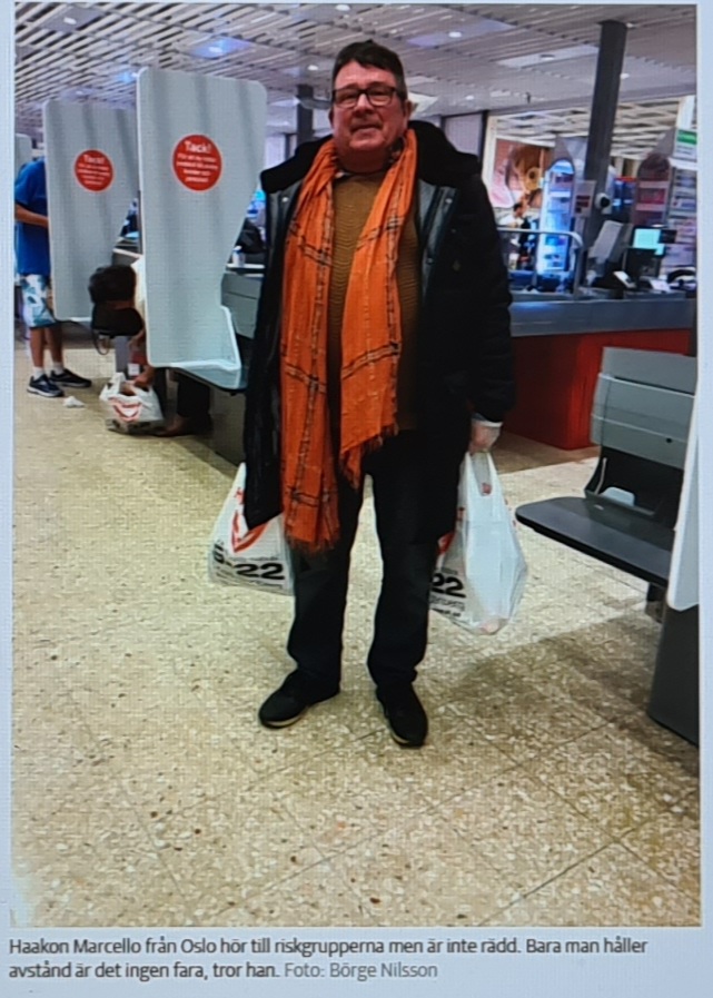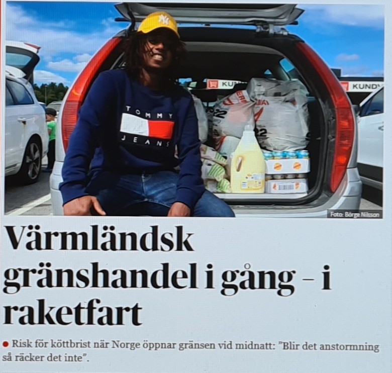 I det andra fallet handlar det om gränshandeln i Värmland som idag kom igång på allvar när Norge beslutade att öppna gränsen mot Sverige, vilket DN belyser i en artikel om att livsmedelsaffärna inte hunnit få fram tillräckligt med kött för att möta den stora efterfrågan. Bildvalet går så klart i klassiskt DN-manér där ”norrmannen” Ali Hussein från Kongsvinger agerar frontfigur. Haakon Marcello från Oslo finns på bild längre ned i artikeln, men han var antagligen för vit för att passa tidningens agenda. Det är trots allt kutym att numera lyfta fram mångkultur i svensk massmedia oavsett om det går till överdrift, medan vit hy och ljushåriga placerats i skamvrån.