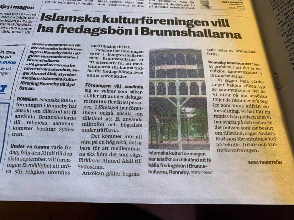 Det handlar om den Islamska kulturföreningen i Ronneby som ansökt till kommunen om att under sensommaren få hålla religiösa sammankomster i Brunnshallarna. Anledningen är att man på grund av corona behöver vara utomhus. Från den 31 juli till den sista september vill man under en timme varje fredag ha möjlighet att utöva sin religion utomhus med tillgång till tak. Föreningen vill använda sig av vakter som säkerställer att det inte blir fler deltagare än 50 personer och man har även ansökt om att få använda högtalare samt mikrofon under träffarna för att medlemmarna ska höra det som sägs. Det kommer enligt styrelsen inte att vara en hög ljudnivå och ansökan gäller begränsade delar av Brunnshallarna.