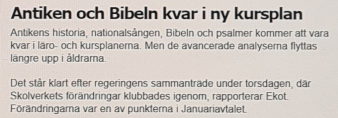För ovanlighetens skull en god nyhet – antikens historia, nationalsången, bibeln och psalmer kommer att vara kvar i läro- och kursplanerna, medan de avancerade analyserna av skönlitterära texter flyttas uppåt i åldrarna.