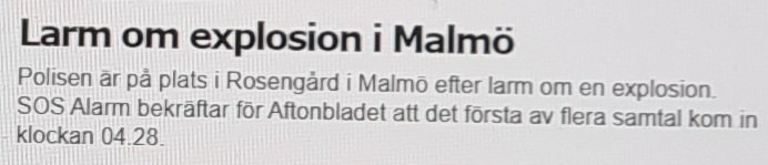 Det gamla vanliga möter en i alla fall på morgonkvisten; explosion i Rosengård, brand i flerfamiljshus i Majorna i Göteborg, skottlossning i Solna, grovt rån och misshandel i Täby, våldtäkter i Spånga respektive Åkersberga, ungdomsgäng som kastade sten på parkeringsvakter i Bergsjön samt två män oprovocerat knivhuggna i Vaxholm.