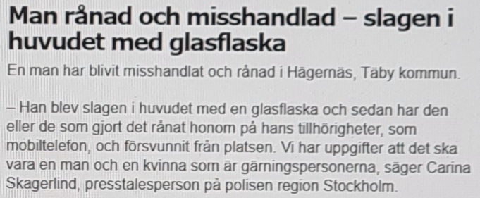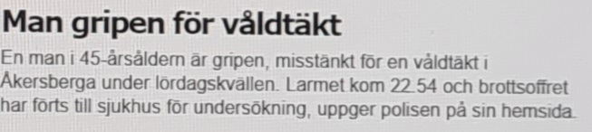 Jag känner mig alltmer härdad och reagerar knappt – ingen har åtminstone dött.🤷‍♀️ Polisen i Stockholm kallar knivattacken i Vaxholm för ett ”vansinnesdåd”, polisen i Malmö säger att det ”bara” var en banger, en av våldtäktsmännen är gripna, stenkastningen var nog ett ”busstreck”, pistolskottet träffade trots allt i foten, branden var säkert en olyckshändelse och den som blev rånad borde förstått att det är oklokt att gå utomhus nattetid.