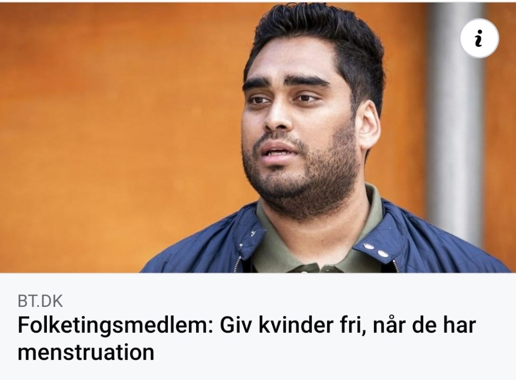 Den danska politikern Sikandar Siddique, politisk vilde i Folketinget och tidigare medlem av Alternativet samt tillika den politiker som tyckte att gårdagens rasindelade Prideparad i Köpenhamn var en jättebra idé, vill nu att danska kvinnor och transsexuella ett visst antal dagar per år ska få vara lediga från arbetet när de har menstruation.