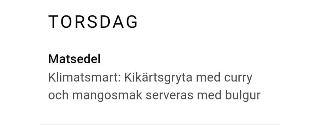 Det här serveras till lunch i barnens skola på torsdag, inget alternativ. Detta betalar vi alltså skatt för – jösses! 🤦‍♀️ Det säger sig själv att de flesta barn inte gillar den här typen av mat så varför kan de inte servera något alternativ? Sedan detta med ”klimatsmart” – vad jag vet producerar vi varken kikärter, curry, mango eller bulgur i Sverige som således måste importeras. Jag blir så trött på att barn i växande ålder inte kan serveras vanlig husmanskost längre! 😡