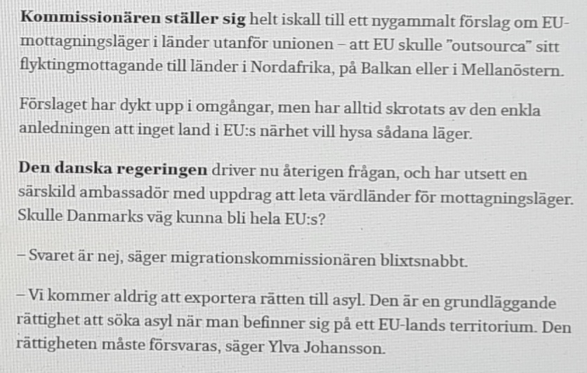 Johansson är öppen med att det är tvingande solidaritet som gäller framöver och gör helt klart att det definitivt inte är aktuellt med att införliva det nygamla förslaget om EU-mottagningsläger i länder utanför unionen – till exempel Nordafrika, Balkan och Mellanöstern – som Danmark återigen driver (heja DK! 🇩🇰).