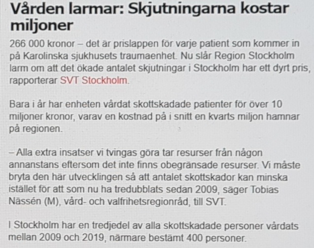 266.000 kr kostar till exempel varje patient som kommer in på Karolinska sjukhusets traumaenhet och bara i år har enheten vårdat skottskadade patienter för över 10 miljoner kronor. Räknar vi dessutom in alla skottskadade i Göteborg, Malmö och Uppsala så blir summan garanterat horribel!