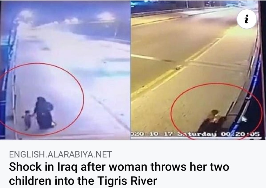 I går identifierades och greps nämligen en kvinna av irakiska myndigheter efter att hon i oktober kastade sina två små barn över bron ned i Tigrisfloden. Man har även lyckats lokalisera och bärga offren av de två drunknade barnen, 3-åriga Hur Mohammed och 1-åriga Masuma Mohammed.