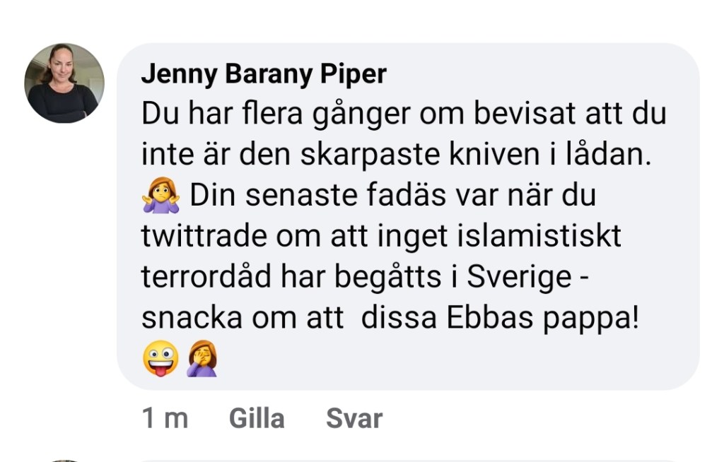 Under åren har hon vräkt ur sig diverse grodor och jag brukar inte lägga någon större vikt vid hennes klavertramp, men gårdagens tweet som uppmärksammades av Isabelle Eriksson, var lite mer svårignorerad när att hon i ett replikskifte med Magnus Ranstorp deklarerade att det inte skett något islamistiskt terrordåd i Sverige trots att Akilovs vidriga attack på Drottninggatan i Stockholm är i färskt minne hos de flesta.
