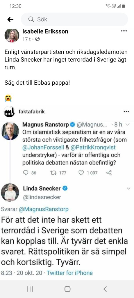 Jag brukar skriva om stolpskotten inom politiken och en av de värsta är Vänsterpartiets supersnille Linda Snecker – en politiker som jag helt tappade förtroendet för efter att hon för några år sedan blockerade mig när jag sakligt ifrågasatte hennes hållning vad gäller migrationspolitiken.