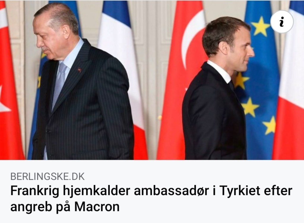 Jag tror att detta som händer i Frankrike passar Erdogan hur bra som helst, hans tanke är ju att göra ett nytt Osmanskt rike. Nu visar han muslimerna att de är han som är den starka ledaren som de behöver, han stödjer Azerbadjan både med vapen och legoknektar, han har precis startat upp den turkiska sidan på Cypern, han letar olja utanför och i Grekland, han har även soldater i Libyen, han vill även ta över stora delar av Syrien. Så ja detta är en farlig man som många ser upp till, han har sin vision klar för sig problemet blir att ena alla muslimer och att de ska se honom som ledare. Bråkar väst med honom så öppnar han gränsen och vips så har Europa fått in några miljoner flyktingar, skulle någon likvidera honom så är risken stor att de blir koas i Turkiet och detta vill väst inte skapa.