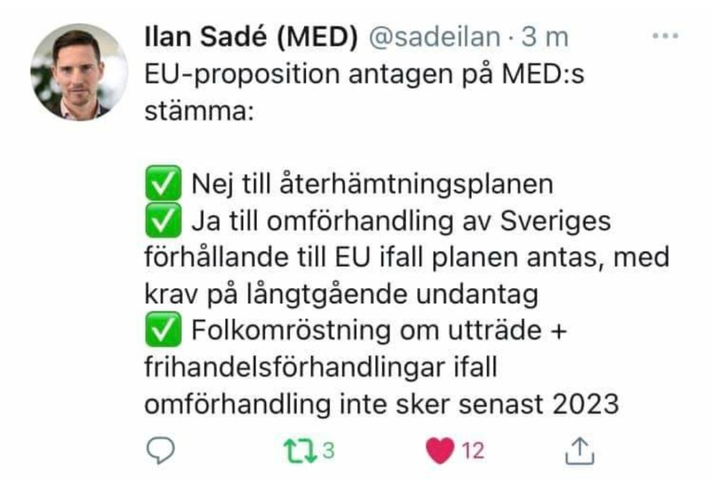 ”Först en sågning av den så kallade återhämtningsplanen. Om, eller snarare när, den antas av bland annat Sveriges riksdag, kommer MED att kräva att Sverige ska kräva omfattande undantag från delar av EU:s beslutsområden. Om detta inte sker, eller om det sker och EU säger nej till sådana omförhandlingar, kommer MED att driva frågan om folkomröstning om ett utträde. Syftet är i så fall, efter ett eventuellt ja till utträde, att få till ett frihandelsavtal med EU, EES och Storbritannien. Tidshorisont för detta: Om ingen omförhandling har kommit i gång, senast under 2023.”