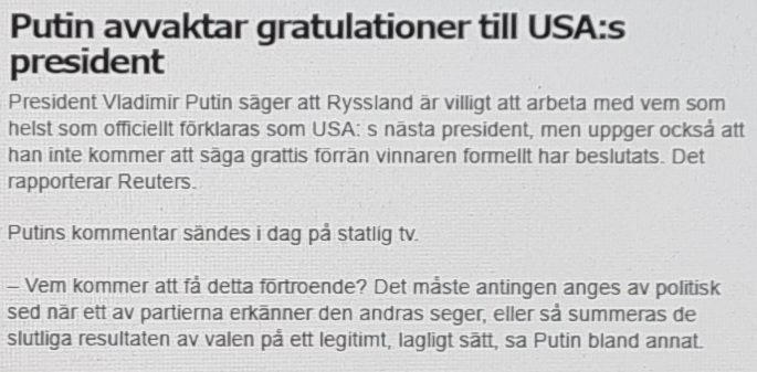 Mycket klokt av Putin som kan stoltsera med att ha sin självaktning i behåll till skillnad från övriga stövelslickare, där framförallt det svenska mediala och politiska etablissemanget har lite att fundera på som knappt kunde bärga sig ens några timmar innan de överröste Biden och Harris med hyllningar utan dess like.