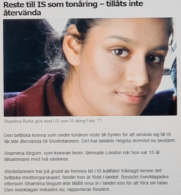 Det är intressant att notera hur Storbritannien hanterar IS-återvändare i jämförelse med Sverige. De flesta minns väl Shamima Begum, som 2015 lämnade London tillsammans med två väninnor när hon var 15 år och reste till Syrien för att ansluta sig till IS, där gifte hon sig med en holländsk rekryt. Efter att kalifatet föll hittades hon i lägret och var då höggravid. Begum har under en längre tid försökt få tillstånd att återvända till Storbritannien, men på grund av hennes tid i IS-kalifatet har man fråntagit hennes brittiska medborgarskap fast hon är född i landet. Beslutet överklagades eftersom Begum inte tillåtits resa in i landet ens för att föra sin talan, men landets Högsta domstol har nu beslutat att avslå överklagan eftersom hon klassificeras som en säkerhetsrisk.