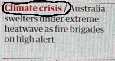 I dag skriver The Guardian om att Australien just nu drabbats av en värmebölja och som av en händelse har de kastat in ”klimatkrisen” som någon sorts kategori för nyheten. Artikeln i sig nämner dock inget om det så kallade klimathotet utan beskriver bara situationen med förväntade temperaturer på upp till 46 grader på vissa ställen samt en pågående skogsbrand som man bekämpar.