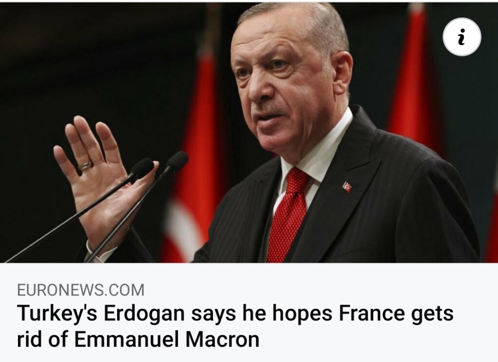I dag efter fredagsbönen i Istanbul attackerade Erdogan på nytt Macron och deklarerade att presidenten är en börda för Frankrike samt att han hoppas att Frankrike gör sig av med problemet Macron så fort som möjligt.