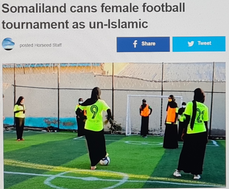 Somaliland Women’s Football Tournament, bestod av sex kvinnliga lag som representerade Somalilands sex divisioner och skulle ha börjat i torsdags förra veckan i huvudstaden Hargeisa. Men Abdirashid Aidid, sportchef vid ministeriet för ungdomar och sport, meddelade att myndigheter ställt in sjudagarsturneringen eftersom det var oislamiskt, det vill säga inte i linje med islamiska värderingar och normer.