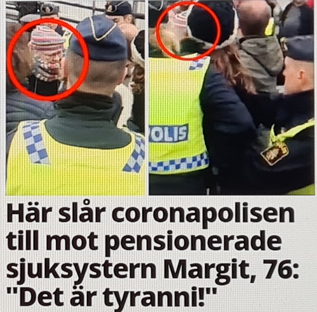 Slutligen är det intressant att notera att protesterna mot lockdown och pandemilagar även nått Sverige och de senaste helgerna har det varit en del organiserade protester mot bakgrund av att man anser att regeringen använder coronapandemin som svepskäl för att inskränka våra fri- och rättigheter. Senast i går skedde en spontan protest i centrala Stockholm mot pandemilagen som i dag träder i kraft och trots en fredlig manifestation gjorde polisen en våldsam insats för att skingra medborgarna. Den 76-åriga sjuksköterskan Margit Olofsdotter Järlebrandt var en av dem som hamnade i tumultet när hon försökte kämpa för vår frihet. Hon och hennes kollega, sjuksköterskan Marianne Liljeholm, deltog i protesten på Odenplan tillsammans med ett 50-tal andra och runt halsen hade Margit hängt en protestlapp med texten: ”Vi såg det komma. Diktaturen i vårt land Sverige”. I en video ser man att när polisen fick order om att skingra folkmassan så började de dra och slita i demonstranterna. Margit som har rullator på grund av sin utslitna rygg skrek åt polisen att sluta eftersom hon höll på att ramla, men de bara fortsatte. Margit var rejält skakad efteråt, men kommer fortsätta protestera så länge hon orkar för sina barn och barnbarns skull.
