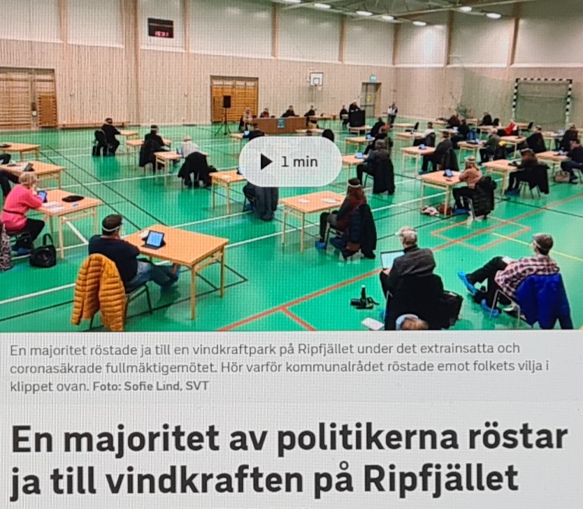 Men som de flesta vid det här laget insett, kryllar Sverige av skrupelfria politiker som helt vänt folket ryggen och bara har sitt eget bästa för sina ögon. Detta fick vi se prov på i dag när en majoritet av politikerna i eftermiddags helt sonika körde över folkets beslut som sade nej till vindkraften och istället röstade ja till planerna på att bygga en vindkraftpark på Ripfjället. Röstsiffrorna blev 22 för och 12 emot, där Socialdemokraterna, Centern och Liberalerna röstade ja, medan Moderaterna, Vänsterpartiet och Sverigedemokraterna röstade nej.