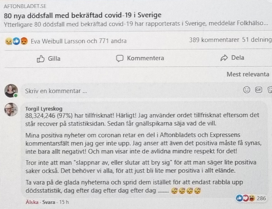 I den rådande nyhetstorkan och de dystra budskapen som 24/7 pumpas ut från våra propagandaorgan, är det upplyftande att läsa kommentarer som Torgils. Vi behöver positiva nyheter, men media frotterar helst på människors rädsla och våra beslutsfattare vill helst att vi ska vara både skräckslagna samt sänkta i skorna eftersom det då är lättare att härska över den stora massan. Enda gången de slår an en positiv ton är i artiklar om hur positiv vaccineringen är. Det är även intressant i sammanhanget varför man tidigare inte rapporterat regelbundna dödsfall på samma sätt när influensan årligen skördat offer, men det är inte samma sak som det heter i folkmun för de flesta tror fortfarande benhårt på den bild de dagligen matas med.