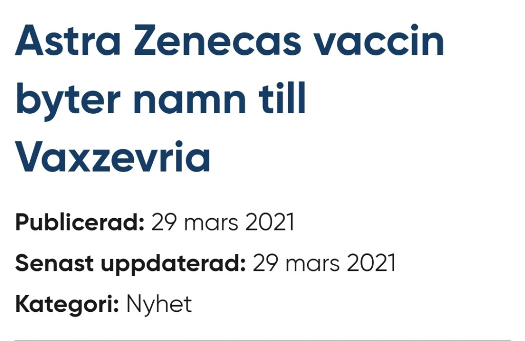 Samtidigt meddelar Läkemedelsverket i dag att man godkänt ett namnbyte på AstraZenecas vaccin på grund av att det fått ett skamfilat rykte efter att flera personer drabbats av allvarliga blodproppar. Efter en snabbehandlad ansökan om namnbyte återlanseras nu vaccinet under det nya namnet Vaxzevria.