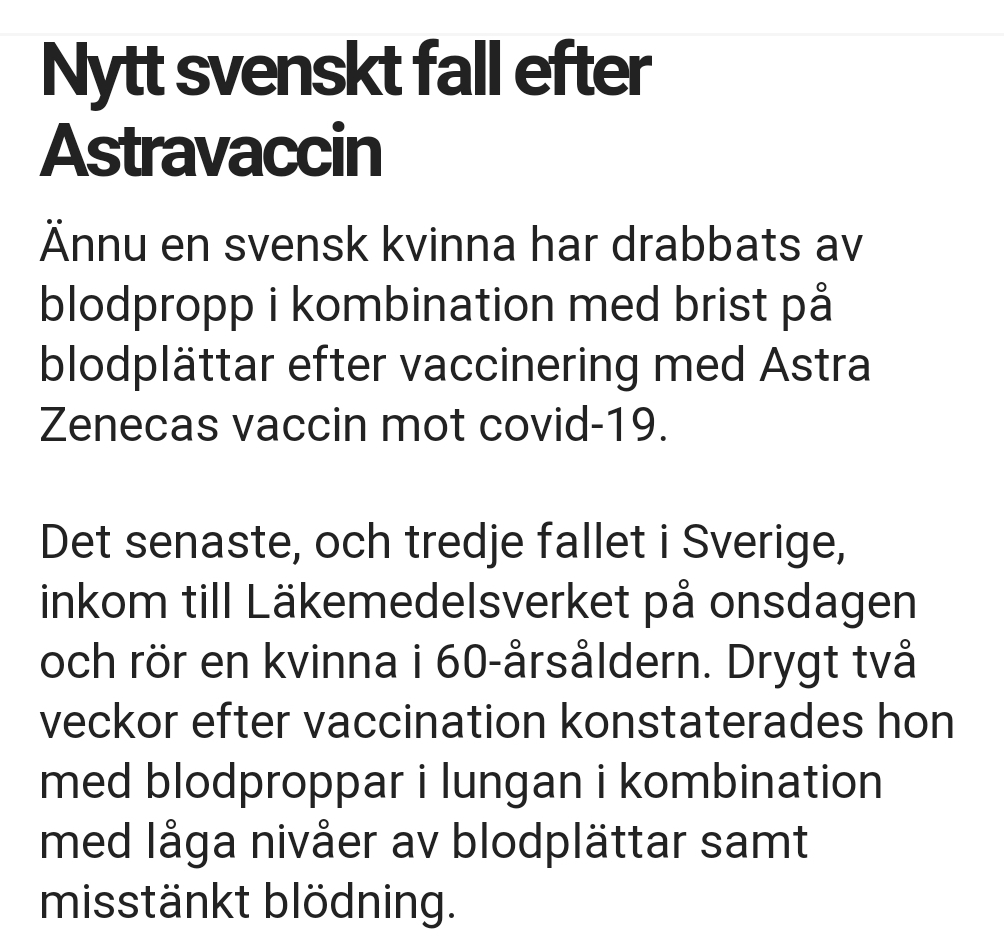 Ännu en svensk kvinna har nu drabbats av blodproppar i lungan efter att ha injicerats med Astra Zenecas vaccin mot Covid-19. Samtidigt gör svensk press sitt bästa för att få folk att indoktrineras att det inte är någon fara med Astras vaccin, bland annat genom att publicera undersökningar där en majoritet av de tillfrågade hade tagit vaccin från Astra Zeneca om de fått erbjudandet samtidigt som man låter diverse experter intyga att det är en så liten procent som drabbas att nyttan överväger riskerna. Sverige är väl snart det enda land I världen som fortsätter vaccinera befolkningen med Astras vaccin – våra nordiska grannländer har som bekant satt det på is och även flera andra länder.
